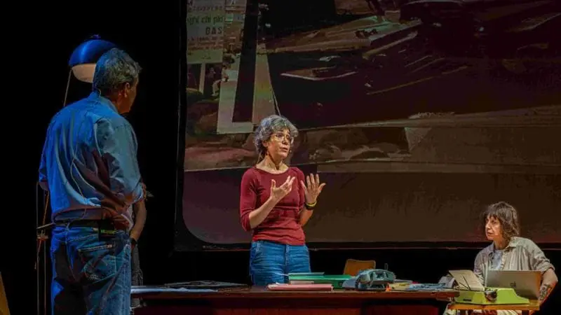 Alla veste teatrale di Anni Settanta: terrore e diritti ci ha pensato il regista Bruno Fornasari: la sua idea è stata di ricreare una stanza che è a metà tra la postazione di un ricercatore e una piccola redazione, dove i tre protagonisti discutono, parlano tra loro e col pubblico, si palleggiano i pensieri mentre sullo sfondo passano immagini e video. “Un ‘dispositivo scenico brechtiano, che funziona perché noi non siamo attori e non pretendiamo di esserlo. Siamo in scena per come siamo, per come lavoriamo: con grande naturalezza e addirittura con le stesse interazioni divertenti di quando ci siamo trovati a scrivere e a pensare questo progetto… D’altra parte il lavoro di scrittura è stato intensivo, e ognuno di noi tre ha portato il proprio bagaglio: Mario ha una valanga di storie , Sara i suoi podcast, io i miei studi. Siamo dovuti arrivare a una sintesi, per equilibrare i momenti drammatici e gli alleggerimenti, per sciogliere le complessità politiche, per scegliere i brani musicali … Ma il teatro io lo amo, non solo perché ti obbliga a tutto questo lavoro di sintesi, ma perché essere insieme ogni sera ha un legame bellissimo proprio con questa dimensione collettiva degli anni Settanta. Ed è una sensazione veramente potente” .